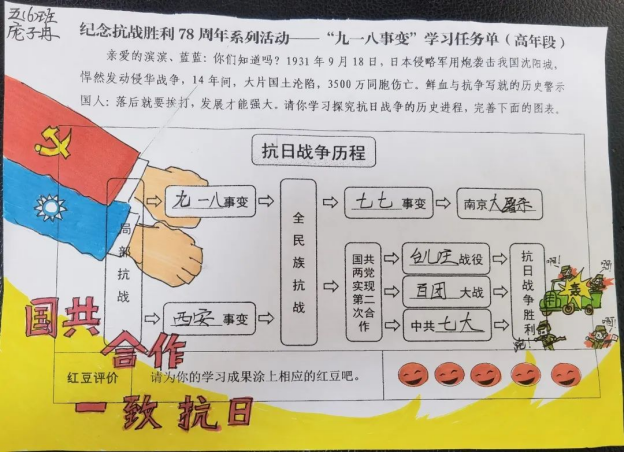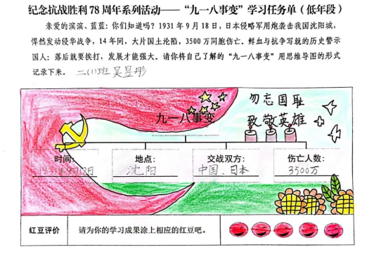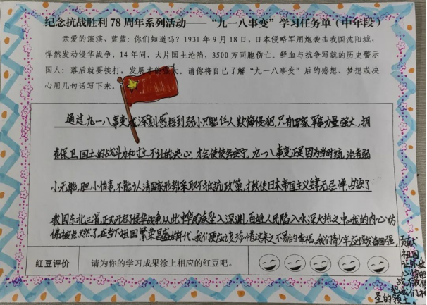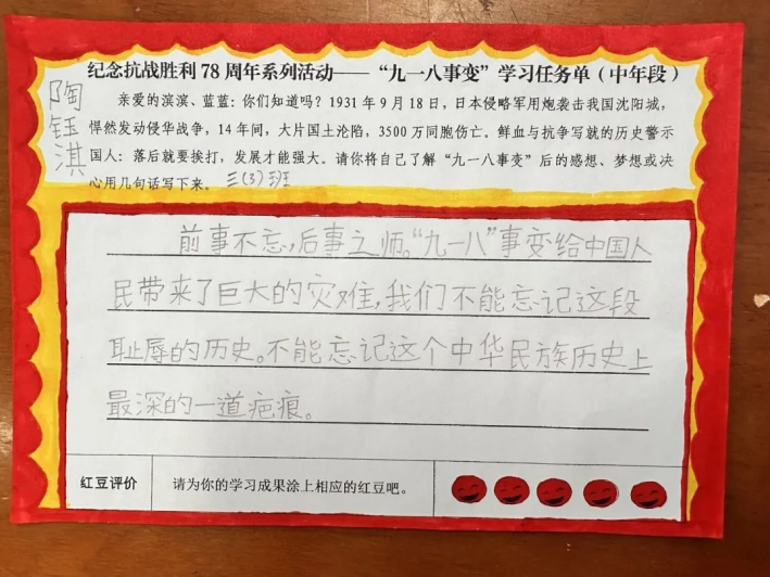 中国人民对战争带来的苦难有着刻骨铭心的记忆,对和平有着孜孜不倦的追求。本次活动前,学校组织全体师生一起观看了纪录片《九一八》节选片段,还精心制作了“九一八事变”学习任务单。通过观看纪录片和完成任务单,引导学生牢记历史,居安思危,把自己的个人成长始终与国家和民族的命运紧紧相连。最后全体师生齐呼:勿忘国耻,强国有我!勿忘国耻,强国有我!全体师生的爱国誓言响彻云霄。