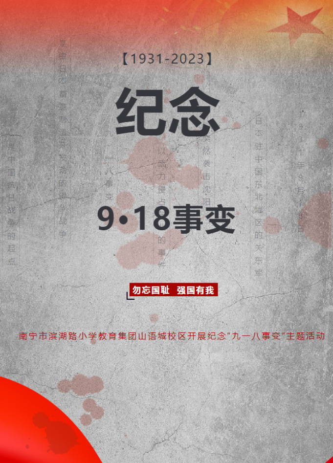 2023年9月18日是“九一八事变”92周年纪念日,南宁市滨湖路小学教育集团山语城校区开展了主题为“勿忘国耻 强国有我”纪念“九一八事变”主题活动。学校通过安全疏散演练、理想大课堂讲话、探究学习任务单等活动,增强了全校师生的安全防范意识,弘扬了爱国主义精神,激励师生为实现中华民族的伟大复兴而继续奋斗。