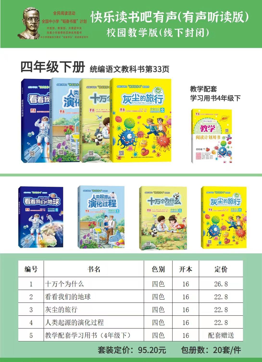 首页 > 我要买教辅书资料 > 年级套装 > 快乐读书吧 四年级 下册(一套5册:十万个为什么、看看我们的地球、灰尘的旅行、人类起源的演化过程、教学配套学习用书)