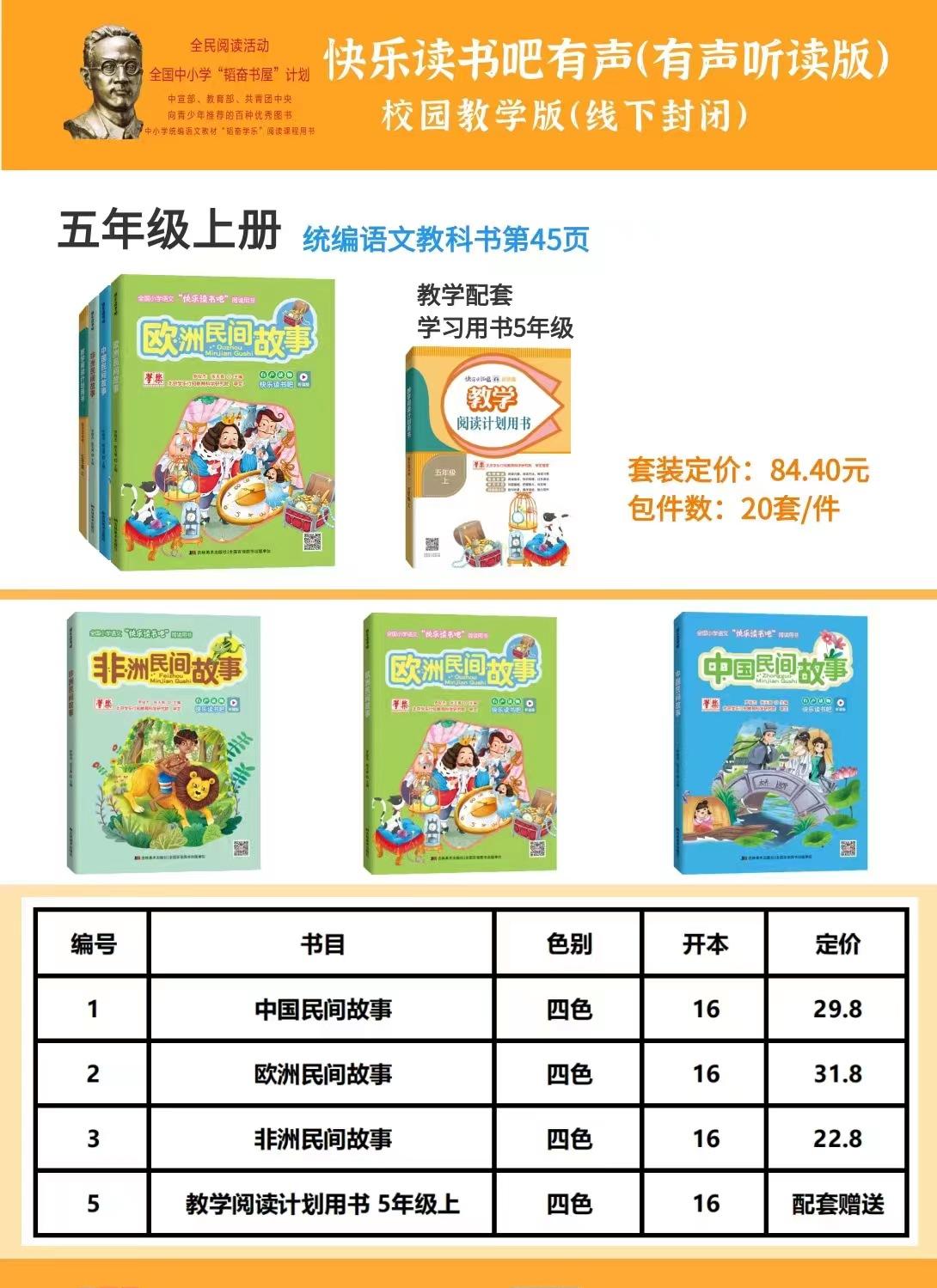 快乐读书吧 五年级 上册(一套4册:中国民间故事、非洲民间故事、欧洲民间故事、教学配套学习用书)